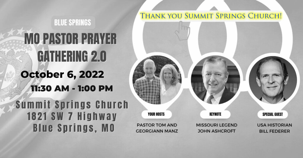 Come attend this ALL-NEW Kansas City area Prayer Event. Join us again, or join us for the first time as our special guests will be Missouri Secretary of State, Jay Ashcroft and America's Historian, Bill Federer!