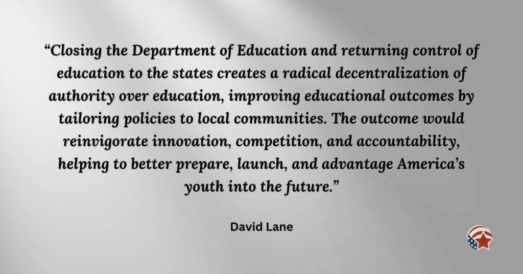 Closing the Department of Education and returning control of education to the states creates a radical decentralization of authority over education, improving educational outcomes by tailoring policies to local communities. The outcome would reinvigorate innovation, competition, and accountability, helping to better prepare, launch, and advantage America’s youth into the future.