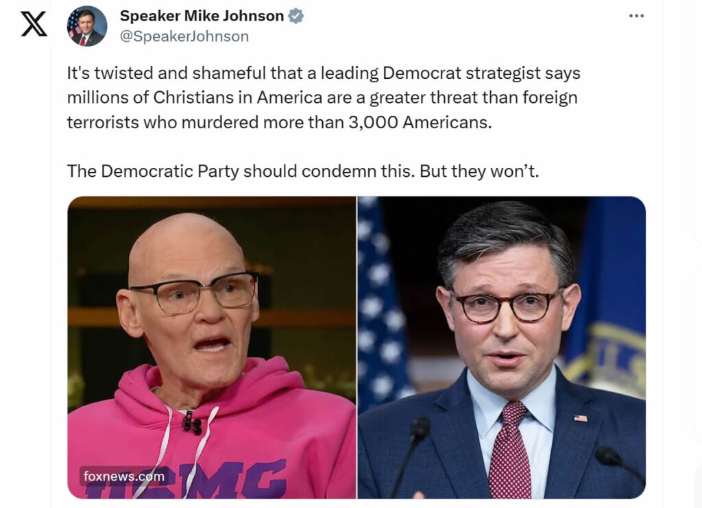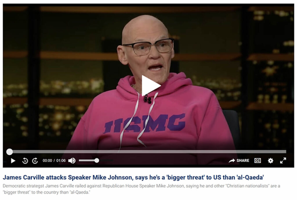 This brings us to Bill Maher. In his recent HBO show Real Time, Maher seamlessly managed to combine the roles of both mocker and fool by deriding the newly elected Speaker of the House Mike Johnson as “conscribing to conspiracy theories and homophobic insults” and adding facetiously that he thought that Mike Johnson wrote a foreword to the Bible.1 Maher had the antiquated Democrat strategist James Carville as one of his show’s guests. On his question whether Carville believed that Mike Johnson could hold together, Carville shot a line of breathless bluster: “First of all I don’t think he can hold this party together. Second, you are exactly right about Mike Johnson and what he believes. He is one of the greatest threats we have today to the United States ... a bigger threat than al-Qaeda.”
